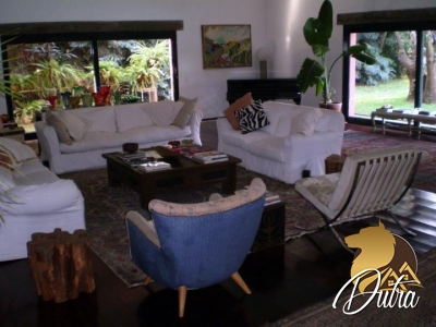 Casa com 241m², sala ampla com lareira, integrada ao quintal com piscina e jardim, cozinha com armários, área de serviço, dependência de empregados, 2 suítes...